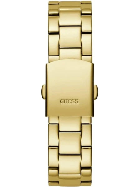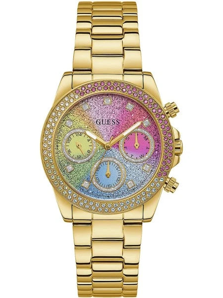 Cette montre analogique de Guess possède un bracelet en acier inoxydable doré, accompagné d’un cadran multicolore.